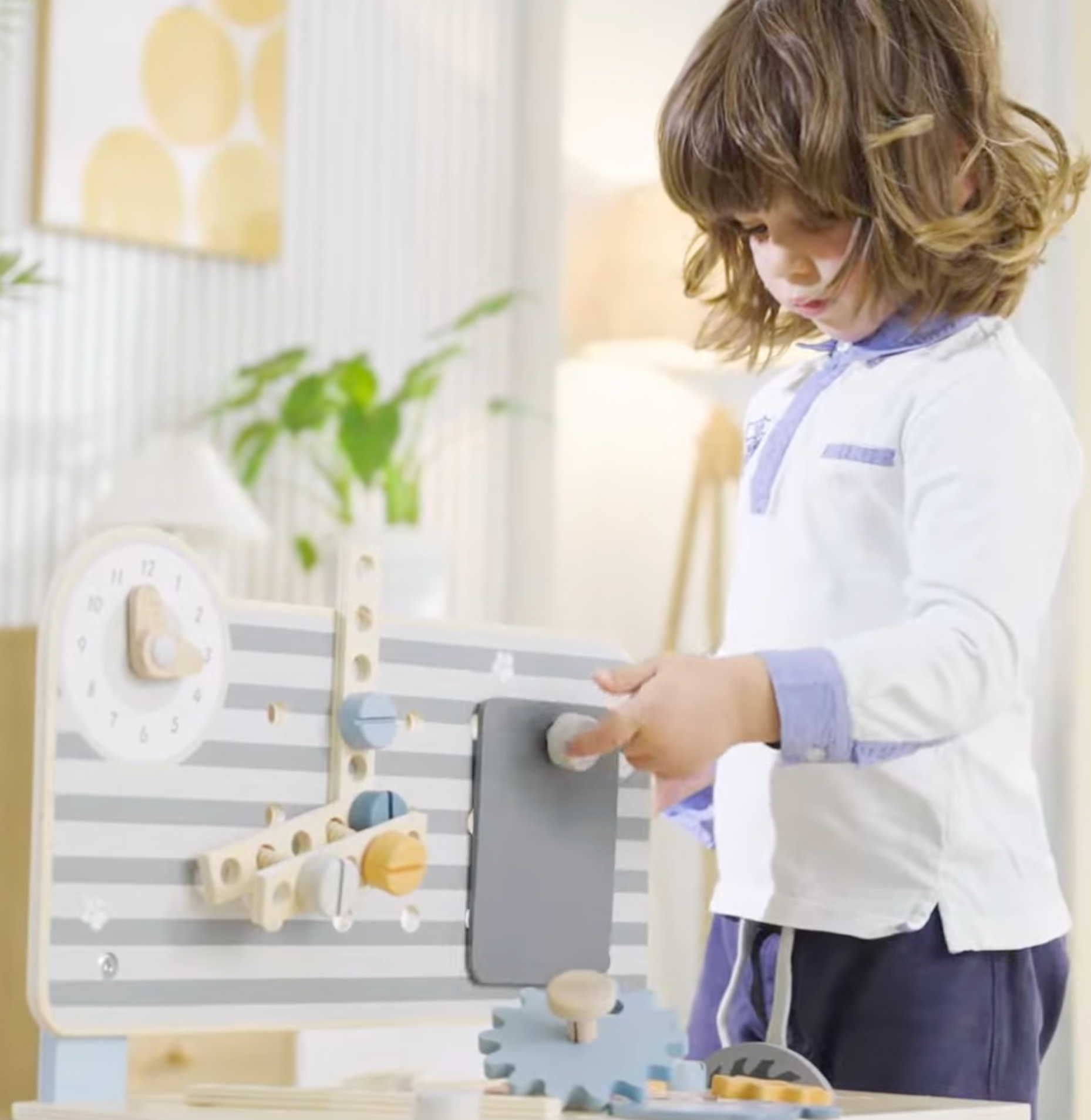 Warsztat majsterkowicza od marki Viga Toys z ekskluzywnej serii PolarB pozwoli poczuć się Twojemu dziecku jak prawdziwy mechanik. Dziecko może wbijać gwoździe, dokręcać śruby kluczem, a także przykręcać drewniane deski i zębatki do stołu warsztatowego. Zabawka posiada zegar ze wskazówkami, drewniane samochodziki oraz różne narzędzia.